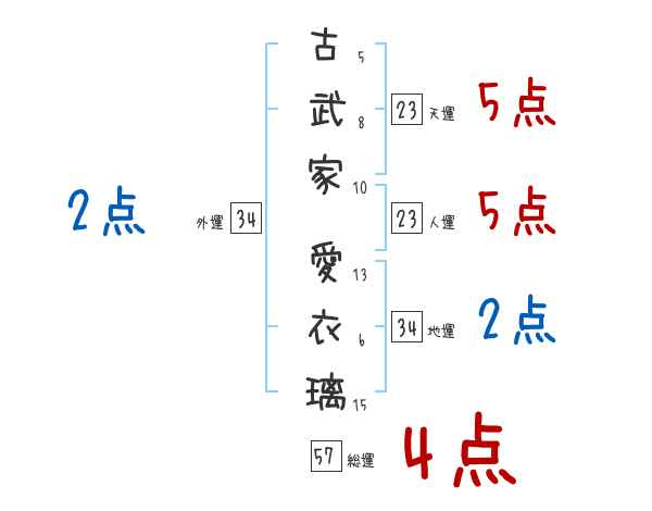 天運![]() | 古武家愛衣璃さんの天運は23画の5つ星!想像力に優れ活力がある。一代で成功し名誉を手に入れる。 家系が持つ宿命的な運勢を表します。祖先から受け継いだ苗字ですので自分の力が及びません。家柄を象徴します。 |