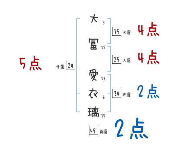 外運![]() | 大冨愛衣璃さんの外運は24画の5つ星!家庭運が良く順調な人生。金運にも恵まれる。 生活面を象徴する運勢です。外部から受ける影響力を表し、結婚運、家庭運や職場、環境への順応性を表します。 |