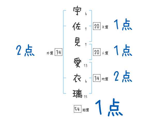 外運![]() | 宇佐見愛衣璃さんの外運は34画の2つ星!独創性に優れるが、自尊心が強く災難に注意しましょう。 生活面を象徴する運勢です。外部から受ける影響力を表し、結婚運、家庭運や職場、環境への順応性を表します。 |