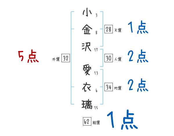 外運![]() | 小金沢愛衣璃さんの外運は32画の5つ星!柔軟性があり成功する。チャンスが多く金運が良い。 生活面を象徴する運勢です。外部から受ける影響力を表し、結婚運、家庭運や職場、環境への順応性を表します。 |