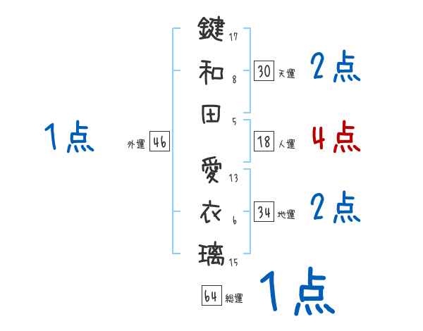 人運![]() | 鍵和田愛衣璃さんの人運は18画の4つ星!情熱的で剛気。忍耐力があり信頼される。 性格や才能などを表す2番目に重要な運勢です。人間関係や協調性、社会的な成功に影響します。主に20歳から50歳ぐらいまでの中年期の運勢を表します。 |