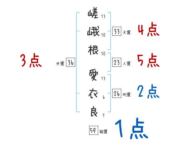 人運![]() | 嵯峨根愛衣良さんの人運は23画の5つ星!想像力に優れ活力がある。一代で成功し名誉を手に入れる。 性格や才能などを表す2番目に重要な運勢です。人間関係や協調性、社会的な成功に影響します。主に20歳から50歳ぐらいまでの中年期の運勢を表します。 |