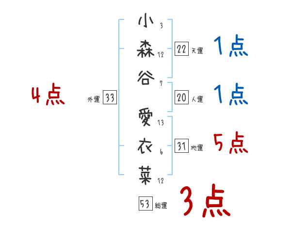 外運![]() | 小森谷愛衣菜さんの外運は33画の4つ星!権力志向でプライドが高い。勇気があり運を切り開き成功する。 生活面を象徴する運勢です。外部から受ける影響力を表し、結婚運、家庭運や職場、環境への順応性を表します。 |