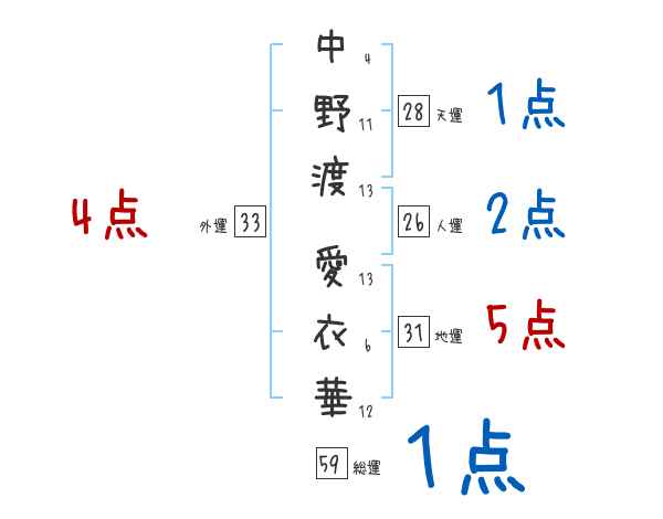 外運![]() | 中野渡愛衣華さんの外運は33画の4つ星!権力志向でプライドが高い。勇気があり運を切り開き成功する。 生活面を象徴する運勢です。外部から受ける影響力を表し、結婚運、家庭運や職場、環境への順応性を表します。 |