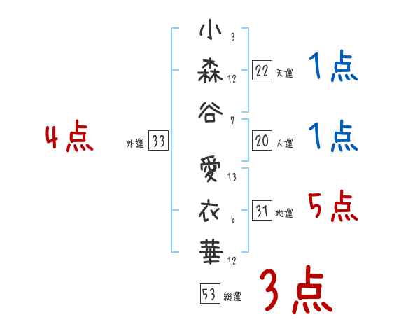外運![]() | 小森谷愛衣華さんの外運は33画の4つ星!権力志向でプライドが高い。勇気があり運を切り開き成功する。 生活面を象徴する運勢です。外部から受ける影響力を表し、結婚運、家庭運や職場、環境への順応性を表します。 |
