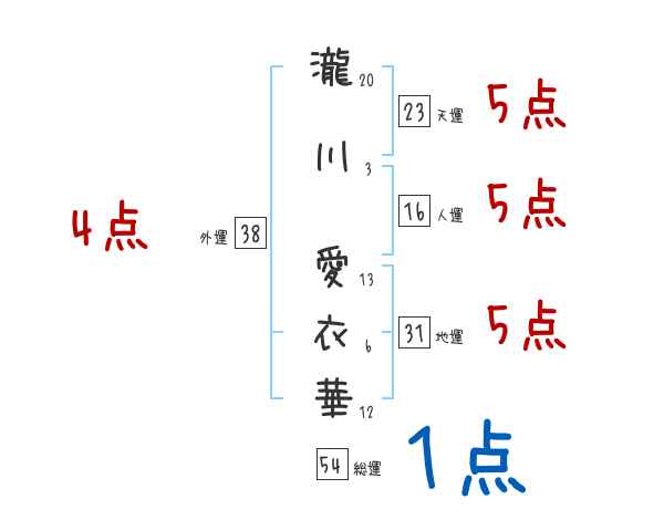 外運![]() | 瀧川愛衣華さんの外運は38画の4つ星!温厚な性格で技術的な才能を発揮する。職人的な仕事に向いている。 生活面を象徴する運勢です。外部から受ける影響力を表し、結婚運、家庭運や職場、環境への順応性を表します。 |