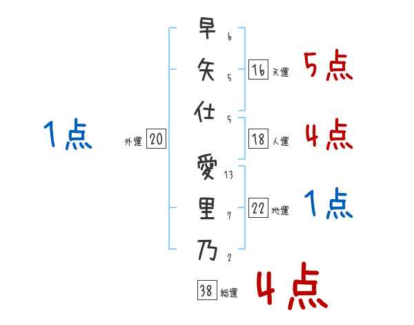 天運![]() | 早矢仕愛里乃さんの天運は16画の5つ星!人望が厚く大きく発展する。逆転成功が見える。 家系が持つ宿命的な運勢を表します。祖先から受け継いだ苗字ですので自分の力が及びません。家柄を象徴します。 |