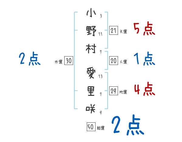 天運![]() | 小野村愛里咲さんの天運は21画の5つ星!統率力がある。独立し成功する。名誉を手に入れる。 家系が持つ宿命的な運勢を表します。祖先から受け継いだ苗字ですので自分の力が及びません。家柄を象徴します。 |