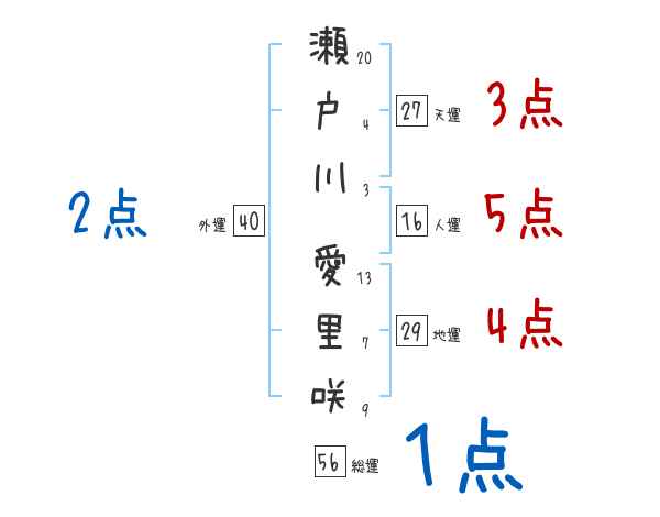 人運![]() | 瀬戸川愛里咲さんの人運は16画の5つ星!人望が厚く大きく発展する。逆転成功が見える。 性格や才能などを表す2番目に重要な運勢です。人間関係や協調性、社会的な成功に影響します。主に20歳から50歳ぐらいまでの中年期の運勢を表します。 |