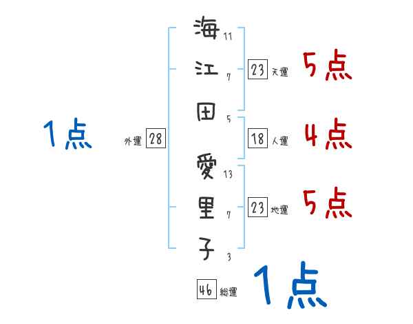 総運![]() | 海江田愛里子さんの総運は46画の1つ星!迷走することが多く苦労するかも。目先のことにとらわれないように。 あなたの人生を表す1番重要な運勢です。生涯を通じて影響する総合運となり、主に50歳以降の晩年期に影響を及ぼします。 |