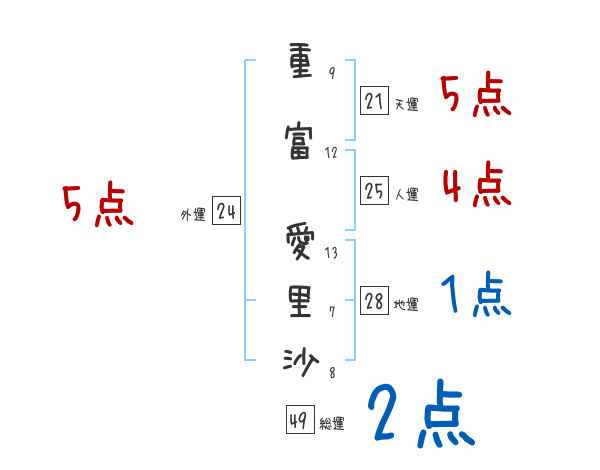 外運![]() | 重富愛里沙さんの外運は24画の5つ星!家庭運が良く順調な人生。金運にも恵まれる。 生活面を象徴する運勢です。外部から受ける影響力を表し、結婚運、家庭運や職場、環境への順応性を表します。 |