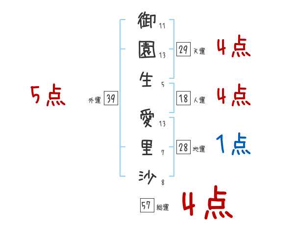 外運![]() | 御園生愛里沙さんの外運は39画の5つ星!社交性に優れ人望が厚い。人の上に立ち成功する。 生活面を象徴する運勢です。外部から受ける影響力を表し、結婚運、家庭運や職場、環境への順応性を表します。 |