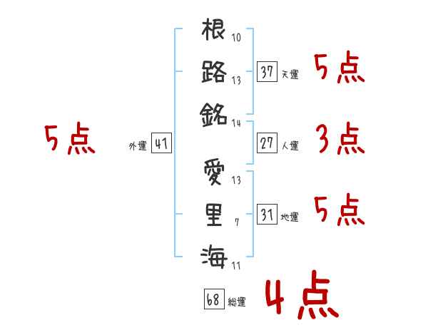 地運![]() | 根路銘愛里海さんの地運は31画の5つ星!社交性があり判断力に優れる。順風満帆な人生で円満な生活。 個性を表す基礎的な運勢です。性格形成や対人関係、行動力など家庭環境に影響されます。主に誕生してから20歳くらいまでの若年期の運勢を表します。 |