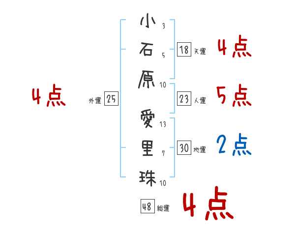 外運![]() | 小石原愛里珠さんの外運は25画の4つ星!個性があり才能があふれる。強運の持ち主で発展する。 生活面を象徴する運勢です。外部から受ける影響力を表し、結婚運、家庭運や職場、環境への順応性を表します。 |