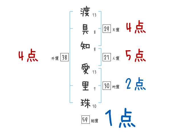外運![]() | 渡具知愛里珠さんの外運は38画の4つ星!温厚な性格で技術的な才能を発揮する。職人的な仕事に向いている。 生活面を象徴する運勢です。外部から受ける影響力を表し、結婚運、家庭運や職場、環境への順応性を表します。 |
