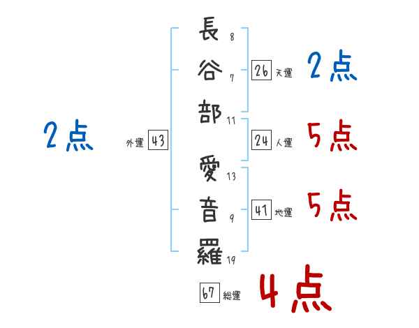 人運![]() | 長谷部愛音羅さんの人運は24画の5つ星!家庭運が良く順調な人生。金運にも恵まれる。 性格や才能などを表す2番目に重要な運勢です。人間関係や協調性、社会的な成功に影響します。主に20歳から50歳ぐらいまでの中年期の運勢を表します。 |