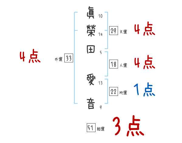 外運![]() | 眞榮田愛音さんの外運は33画の4つ星!権力志向でプライドが高い。勇気があり運を切り開き成功する。 生活面を象徴する運勢です。外部から受ける影響力を表し、結婚運、家庭運や職場、環境への順応性を表します。 |