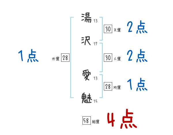 地運![]() | 湯沢愛魅さんの地運は28画の1つ星!家庭環境に注意。スポーツで活躍できる能力があるかも。 個性を表す基礎的な運勢です。性格形成や対人関係、行動力など家庭環境に影響されます。主に誕生してから20歳くらいまでの若年期の運勢を表します。 |