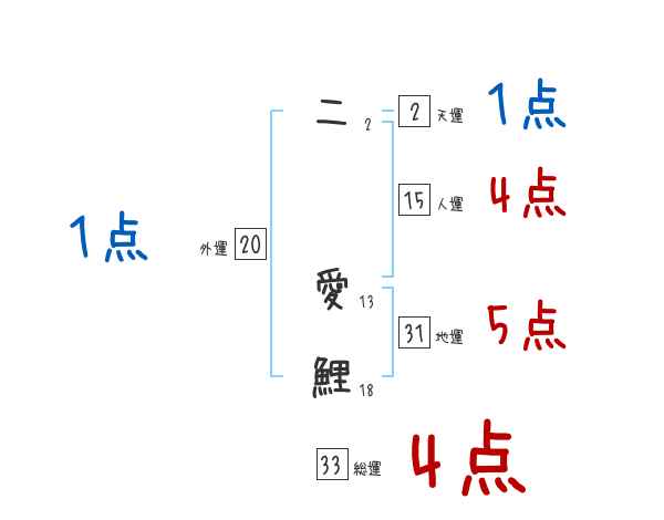 天運![]() | 二愛鯉さんの天運は2画の1つ星!優しいですが積極性や意思の強さに欠ける傾向があります。家庭環境の乱れに注意しましょう。 家系が持つ宿命的な運勢を表します。祖先から受け継いだ苗字ですので自分の力が及びません。家柄を象徴します。 |