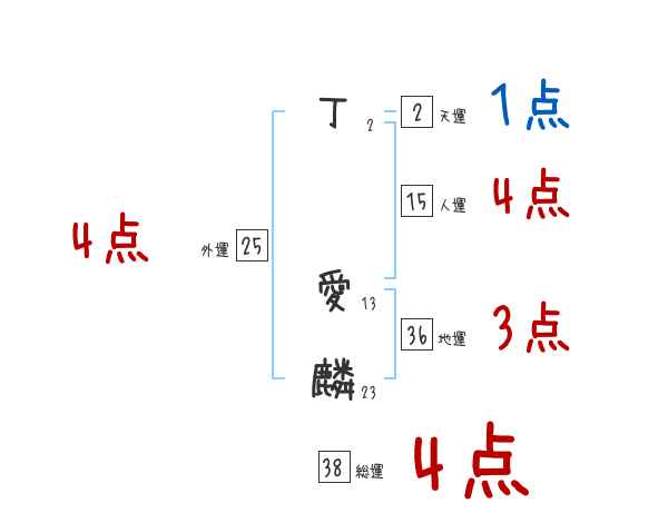 天運![]() | 丁愛麟さんの天運は2画の1つ星!優しいですが積極性や意思の強さに欠ける傾向があります。家庭環境の乱れに注意しましょう。 家系が持つ宿命的な運勢を表します。祖先から受け継いだ苗字ですので自分の力が及びません。家柄を象徴します。 |