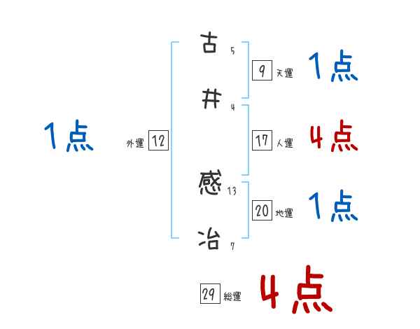 天運![]() | 古井感冶さんの天運は9画の1つ星!消極的で才能を発揮することが苦手なことも。周りの意見に耳を傾けましょう。 家系が持つ宿命的な運勢を表します。祖先から受け継いだ苗字ですので自分の力が及びません。家柄を象徴します。 |