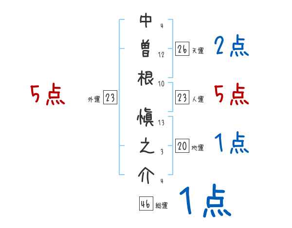 人運![]() | 中曽根愼之介さんの人運は23画の5つ星!想像力に優れ活力がある。一代で成功し名誉を手に入れる。 性格や才能などを表す2番目に重要な運勢です。人間関係や協調性、社会的な成功に影響します。主に20歳から50歳ぐらいまでの中年期の運勢を表します。 |