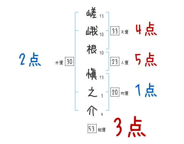 外運![]() | 嵯峨根愼之介さんの外運は30画の2つ星!浮き沈みの激しさに注意しましょう。 生活面を象徴する運勢です。外部から受ける影響力を表し、結婚運、家庭運や職場、環境への順応性を表します。 |