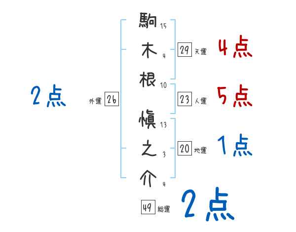 外運![]() | 駒木根愼之介さんの外運は26画の2つ星!波瀾万丈かも。信頼できる人を大事にしましょう。 生活面を象徴する運勢です。外部から受ける影響力を表し、結婚運、家庭運や職場、環境への順応性を表します。 |