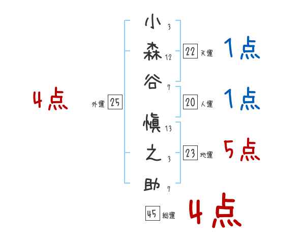 総運![]() | 小森谷愼之助さんの総運は45画の4つ星!もくもくと物事を進め達成する。地味な努力家。 あなたの人生を表す1番重要な運勢です。生涯を通じて影響する総合運となり、主に50歳以降の晩年期に影響を及ぼします。 |