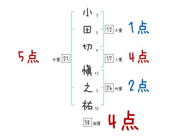 | 総運  | 小田切愼之祐さんの総運は38画の4つ星!温厚な性格で技術的な才能を発揮する。職人的な仕事に向いている。あなたの人生を表す1番重要な運勢です。生涯を通じて影響する総合運となり、主に50歳以降の晩年期に影響を及ぼします。 |