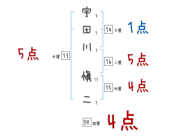 人運![]() | 宇田川愼二さんの人運は16画の5つ星!人望が厚く大きく発展する。逆転成功が見える。 性格や才能などを表す2番目に重要な運勢です。人間関係や協調性、社会的な成功に影響します。主に20歳から50歳ぐらいまでの中年期の運勢を表します。 |