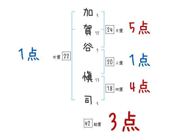 天運![]() | 加賀谷愼司さんの天運は24画の5つ星!家庭運が良く順調な人生。金運にも恵まれる。 家系が持つ宿命的な運勢を表します。祖先から受け継いだ苗字ですので自分の力が及びません。家柄を象徴します。 |
