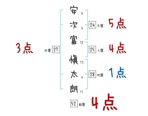 天運![]() | 安次富愼太朗さんの天運は24画の5つ星!家庭運が良く順調な人生。金運にも恵まれる。 家系が持つ宿命的な運勢を表します。祖先から受け継いだ苗字ですので自分の力が及びません。家柄を象徴します。 |