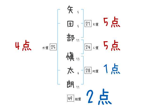 天運![]() | 矢田部愼太朗さんの天運は21画の5つ星!統率力がある。独立し成功する。名誉を手に入れる。 家系が持つ宿命的な運勢を表します。祖先から受け継いだ苗字ですので自分の力が及びません。家柄を象徴します。 |