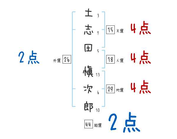 総運![]() | 土志田愼次郎さんの総運は44画の2つ星!誠実で慎重な性格。物事を考えすぎないように注意しましょう。 あなたの人生を表す1番重要な運勢です。生涯を通じて影響する総合運となり、主に50歳以降の晩年期に影響を及ぼします。 |