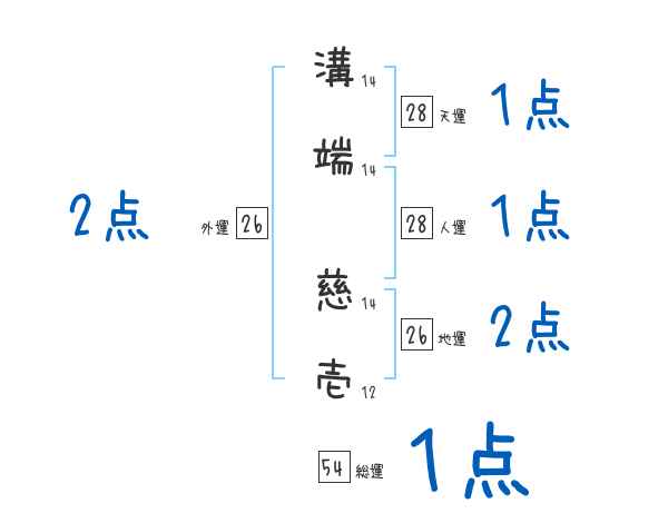 人運![]() | 溝端慈壱さんの人運は28画の1つ星!家庭環境に注意。スポーツで活躍できる能力があるかも。 性格や才能などを表す2番目に重要な運勢です。人間関係や協調性、社会的な成功に影響します。主に20歳から50歳ぐらいまでの中年期の運勢を表します。 |