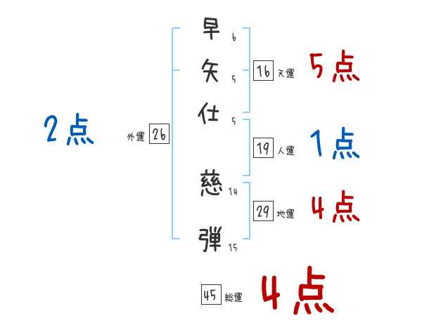 外運![]() | 早矢仕慈弾さんの外運は26画の2つ星!波瀾万丈かも。信頼できる人を大事にしましょう。 生活面を象徴する運勢です。外部から受ける影響力を表し、結婚運、家庭運や職場、環境への順応性を表します。 |
