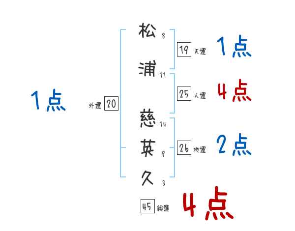地運![]() | 松浦慈英久さんの地運は26画の2つ星!波瀾万丈かも。信頼できる人を大事にしましょう。 個性を表す基礎的な運勢です。性格形成や対人関係、行動力など家庭環境に影響されます。主に誕生してから20歳くらいまでの若年期の運勢を表します。 |