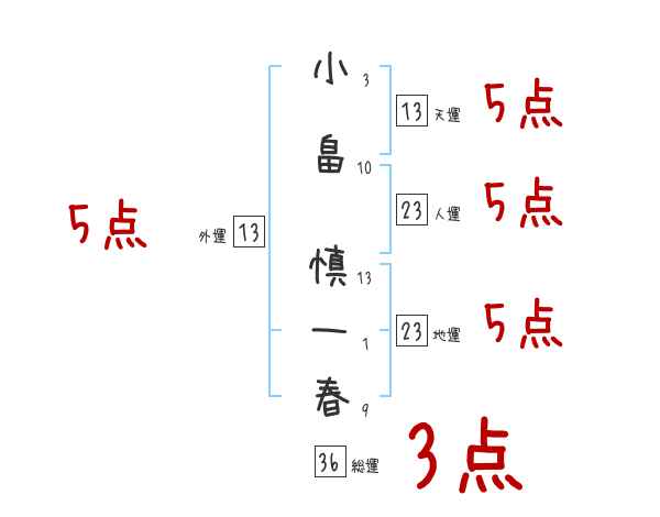 総運![]() | 小畠慎一春さんの総運は36画の3つ星!先見性が豊かです。多少神経質で苦労することも。 あなたの人生を表す1番重要な運勢です。生涯を通じて影響する総合運となり、主に50歳以降の晩年期に影響を及ぼします。 |