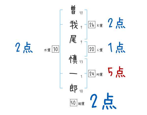 総運![]() | 曽我尾慎一郎さんの総運は50画の2つ星!浮き沈みが激しく不安定。しりすぼみに衰退しやすいので注意しましょう。 あなたの人生を表す1番重要な運勢です。生涯を通じて影響する総合運となり、主に50歳以降の晩年期に影響を及ぼします。 |