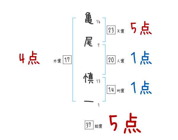 外運![]() | 亀尾慎一さんの外運は17画の4つ星!積極的な行動力。地位を気づき財産を手に入れる。純粋な心と直感力。 生活面を象徴する運勢です。外部から受ける影響力を表し、結婚運、家庭運や職場、環境への順応性を表します。 |