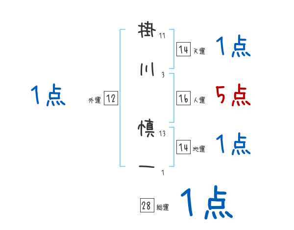 人運![]() | 掛川慎一さんの人運は16画の5つ星!人望が厚く大きく発展する。逆転成功が見える。 性格や才能などを表す2番目に重要な運勢です。人間関係や協調性、社会的な成功に影響します。主に20歳から50歳ぐらいまでの中年期の運勢を表します。 |