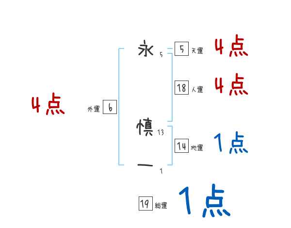 天運![]() | 永慎一さんの天運は5画の4つ星!健康で安泰。協調性に優れ、財産に恵まれる。 家系が持つ宿命的な運勢を表します。祖先から受け継いだ苗字ですので自分の力が及びません。家柄を象徴します。 |