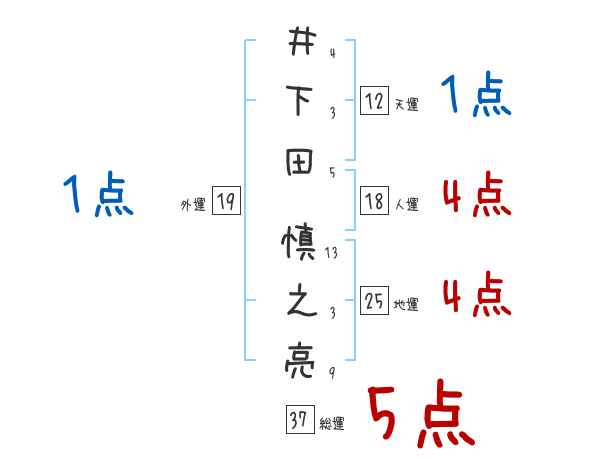 天運![]() | 井下田慎之亮さんの天運は12画の1つ星!簡単な失敗で諦めてしまいやすいかも。着実に行動すると良いでしょう。 家系が持つ宿命的な運勢を表します。祖先から受け継いだ苗字ですので自分の力が及びません。家柄を象徴します。 |