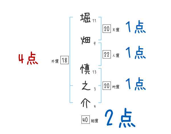 外運![]() | 堀畑慎之介さんの外運は18画の4つ星!情熱的で剛気。忍耐力があり信頼される。 生活面を象徴する運勢です。外部から受ける影響力を表し、結婚運、家庭運や職場、環境への順応性を表します。 |