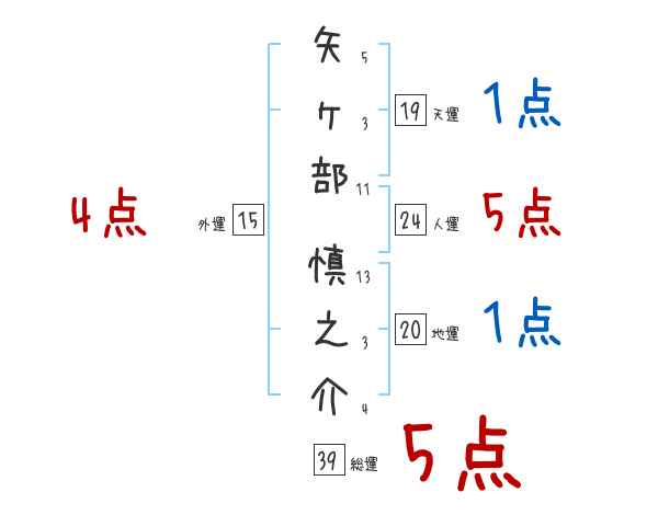 天運![]() | 矢ヶ部慎之介さんの天運は19画の1つ星!優れた才能を持ちますが、協調性が足りないことも。周りの人と協力する事を意識しましょう。 家系が持つ宿命的な運勢を表します。祖先から受け継いだ苗字ですので自分の力が及びません。家柄を象徴します。 |