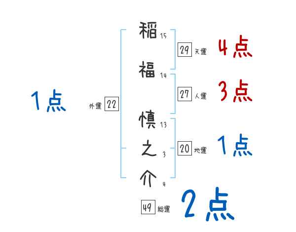外運![]() | 稲福慎之介さんの外運は22画の1つ星!努力することが苦手ないっぽう手先が器用。芸術性にも優れる。 生活面を象徴する運勢です。外部から受ける影響力を表し、結婚運、家庭運や職場、環境への順応性を表します。 |