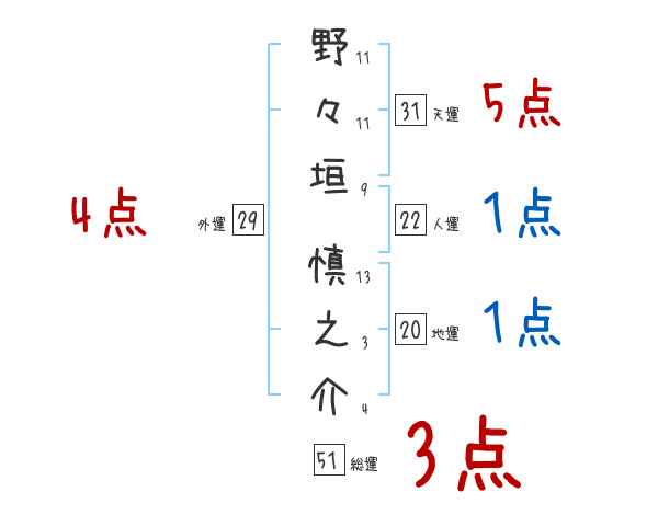 外運![]() | 野々垣慎之介さんの外運は29画の4つ星!完全主義で才能がある。厳格な心の持ち主。 生活面を象徴する運勢です。外部から受ける影響力を表し、結婚運、家庭運や職場、環境への順応性を表します。 |