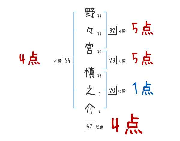 天運![]() | 野々宮慎之介さんの天運は32画の5つ星!柔軟性があり成功する。チャンスが多く金運が良い。 家系が持つ宿命的な運勢を表します。祖先から受け継いだ苗字ですので自分の力が及びません。家柄を象徴します。 |