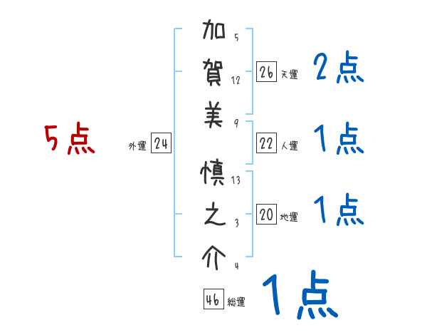 外運![]() | 加賀美慎之介さんの外運は24画の5つ星!家庭運が良く順調な人生。金運にも恵まれる。 生活面を象徴する運勢です。外部から受ける影響力を表し、結婚運、家庭運や職場、環境への順応性を表します。 |